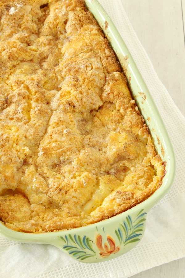 The result is a gooey, cakey peach cobbler. If you’ve ever tasted gooey butter cake, it’s a lot like that but with peaches baked into it.