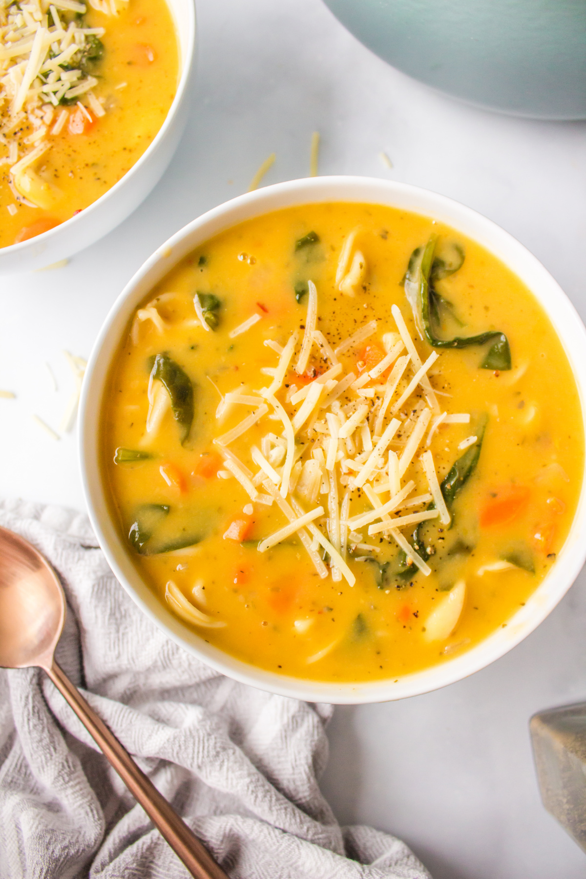 This creamy Cheese Tortellini Soup recipe is filled with tortellini pasta, carrots, onions and spinach in a delicious creamy broth. This is the best comfort food soup recipe that will be ready in less than 30 minutes!