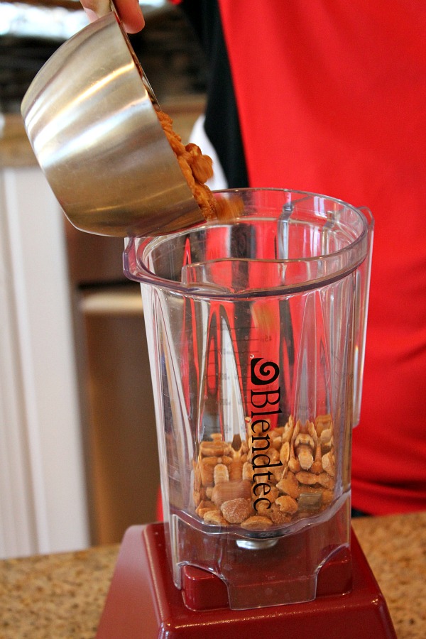 • Pour your peanuts in your heavy duty blender or food processor and process them until they're ground up and paste-like.