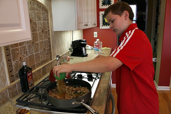 First you need to prepare the taco filling. Saute the onions, then add the meat, and finally add the spices and beans.