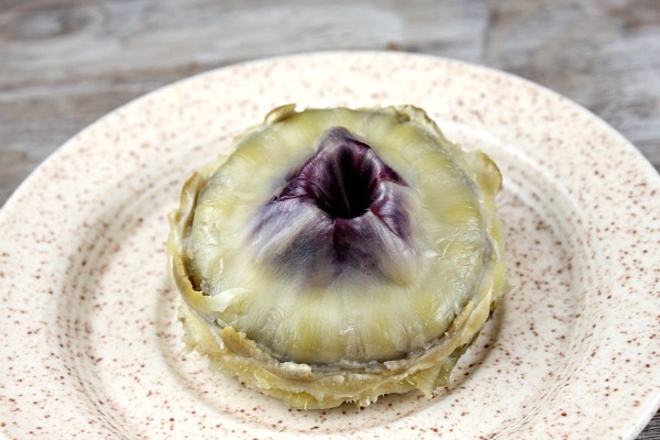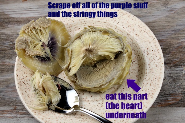 After you have scraped the purple stuff and stringy things off, you can eat the heart of the artichoke (the part underneath). I personally do not like this part, but my family does.