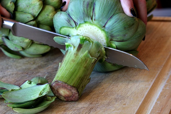 a little part of me dies every time I see someone cut the stem from an artichoke. You peel the hard, bitter outter skin, then the stem is as tastey and edible as the heart. Buy artichokes with a firm, tightly packed head and a long thick stem.