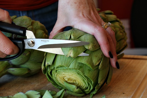 Cut off the top of the artichoke so that it can steam better and most of the spiky leaves are gone.