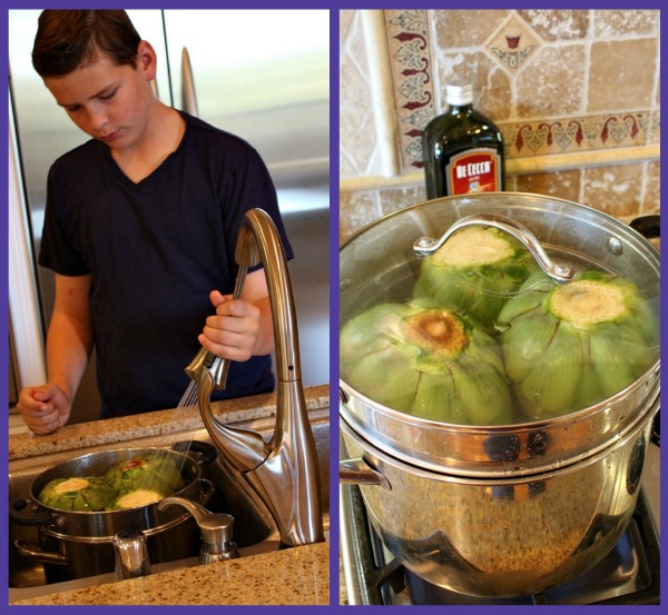 You have to put the artichokes- top side down- in a large pot with a steamer insert and add about an inch of water to the bottom of the pot. Put the lid on. Then you can put the stove on high until the water starts boiling and then just let it simmer on low for 50 minutes to 1 hour (Until a fork slides into the bottom of an artichoke easily). After your artichokes are done, you can remove them from the pot and set them on a plate to cool.