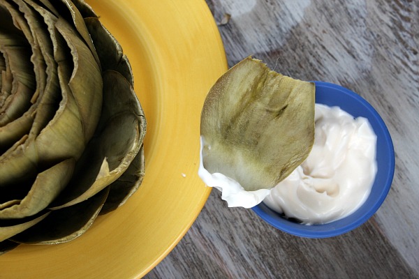 You eat the artichokes by peeling off the leaves and scraping off the flesh with your front teeth. Mayonnaise is a popular option for dipping the artichoke leaves in. If you don’t like mayonnaise, you can also use melted butter.