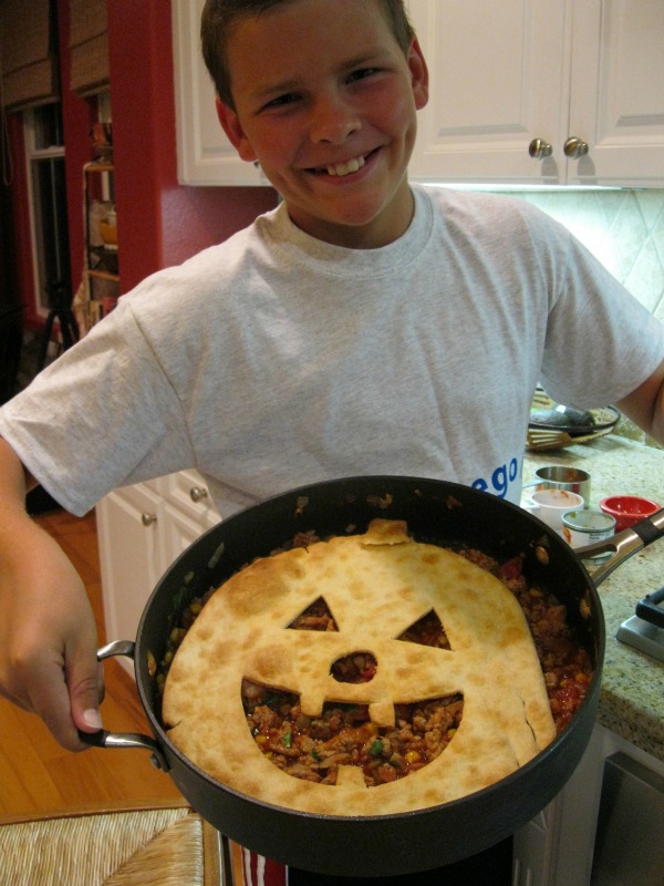 Carefully place the baked jack o’ lantern crust on top of the turkey mixture in the skillet and serve!