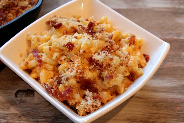 - In a microwave-safe bowl, melt the remaining 5 tablespoons butter in the microwave. Add the bread crumbs, bacon and Parmesan and stir to combine. Sprinkle over the mac and cheese, and bake for 25 to 30 minutes, until hot and bubbly.