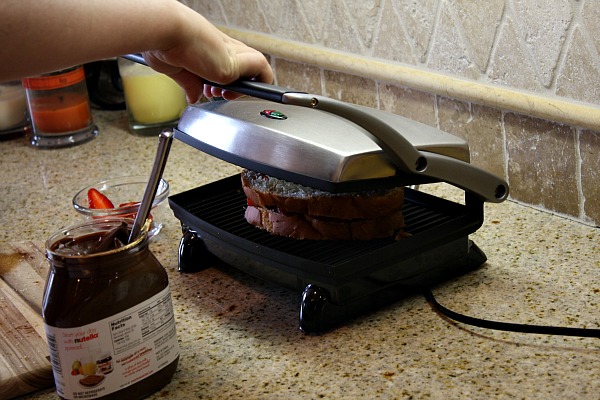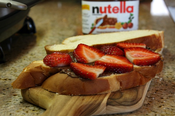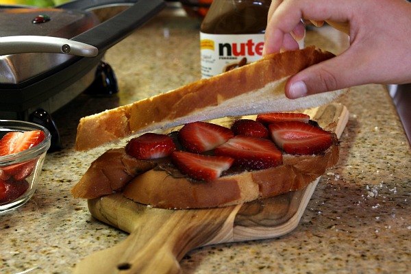As soon as you put the top piece of bread on the strawberries and Nutella, you are ready to put the Strawberry- Nutella Panini on the panini press.