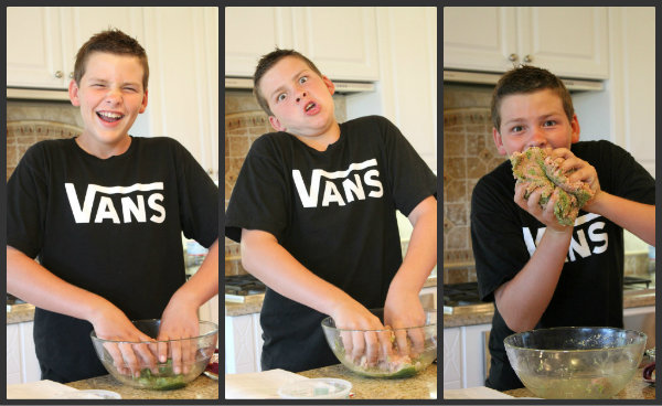 The turkey/pesto mixture felt weird when I kneaded it. You can see my mixed reactions.